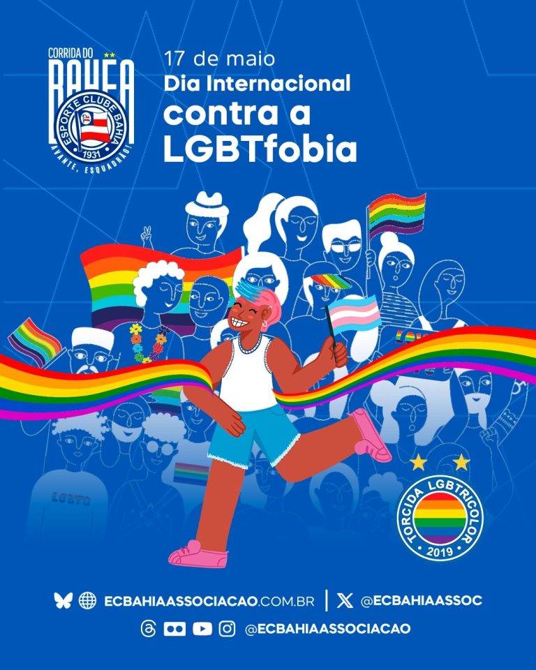 Neste 17 de maio, Dia Internacional contra a LGBTfobia, além de reafirmar seu posicionamento, o EC Bahia (Associação) reforça a necessidade de incluir pessoas LGBTQIAPN+ nos mais variados espaços ocupados pelo Clube. Por isso, anuncia que destinará gratuitamente a membros da Torcida LGBTricolor dez vagas da 2ª Corrida do Bahêa, em 8 de junho, no Jardim de Alah, em Salvador.