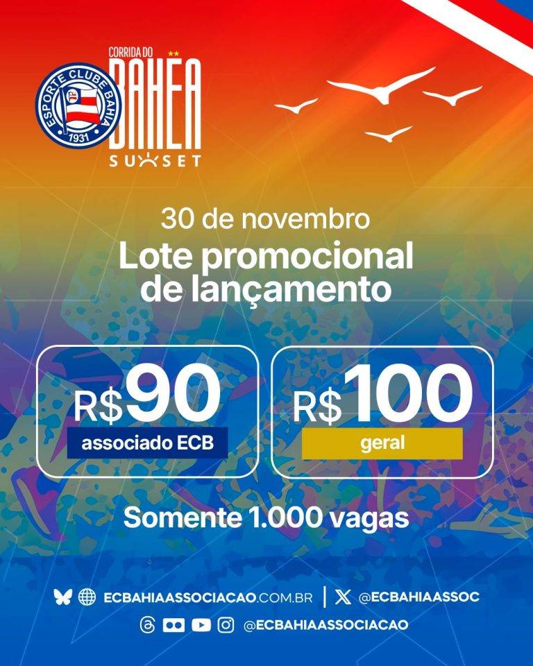 Poucas horas depois de ter levado mais de 5,5 mil pessoas ao Jardim de Alah, a Corrida do Bahêa dá a largada para as inscrições na terceira edição do evento, AQUI. A prova está prevista para acontecer em 30 de novembro, um domingo, em Salvador. Em lote promocional de lançamento, até mil tricolores poderão garantir presença por R$ 90 (associado ECB) ou R$ 100 (geral).